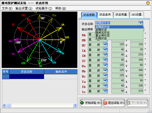 在微機(jī)繼電保護(hù)測(cè)試儀(鍵盤(pán)版)界面右邊的“狀態(tài)參數(shù)”屬性頁(yè)中設(shè)置當(dāng)前狀態(tài)的狀態(tài)名稱(chēng)、輸出頻率和各通道的輸出類(lèi)型、幅值、相位。