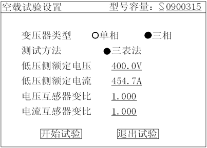 2)在主界面中選擇空載試驗,則顯示空載試驗設置界面如下圖: