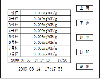 輕觸屏幕上的“上頁”、“下頁”鍵,可以查找測試過的結果,輕觸“打印”鍵,可以打印頁面顯示內容;輕觸“退出”鍵,即退出顯示界面。