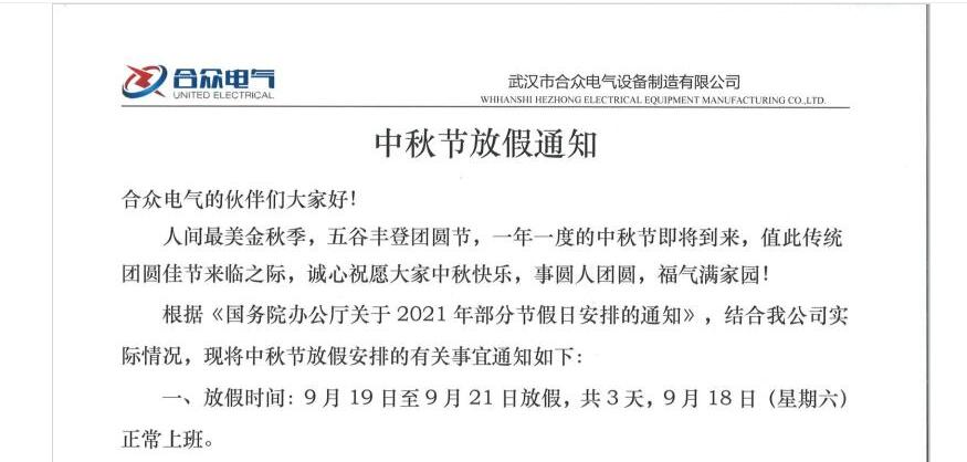合眾電氣中秋節員工福利及放假通知